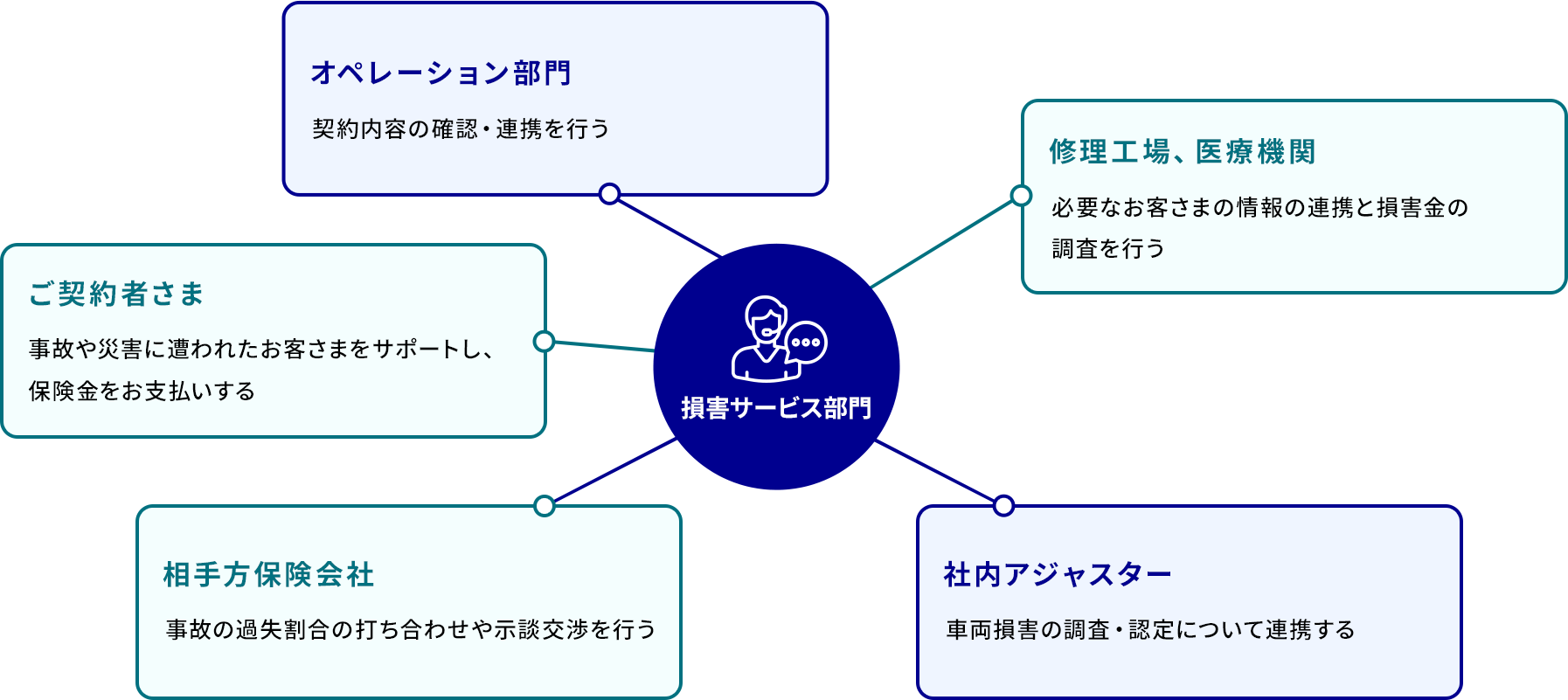 損害サービス部門は、事故や災害に遭われたお客さまの事故解決を図り、最終的に保険金をお支払いすることで、お客さまに安心を提供する役割を担っています。具体的には、事故報告の受付から保険金の支払までを担当し、事故関係者、相手保険会社、弁護士、自動車修理工場、医療機関などと連携し、損害額の算出と査定を行います。また、事故が発生した際は、その事故に対しての責任割合(過失割合)を相手方や保険会社と話し合いながら交渉し、示談解決まで進めていくことも重要な役割となっています。